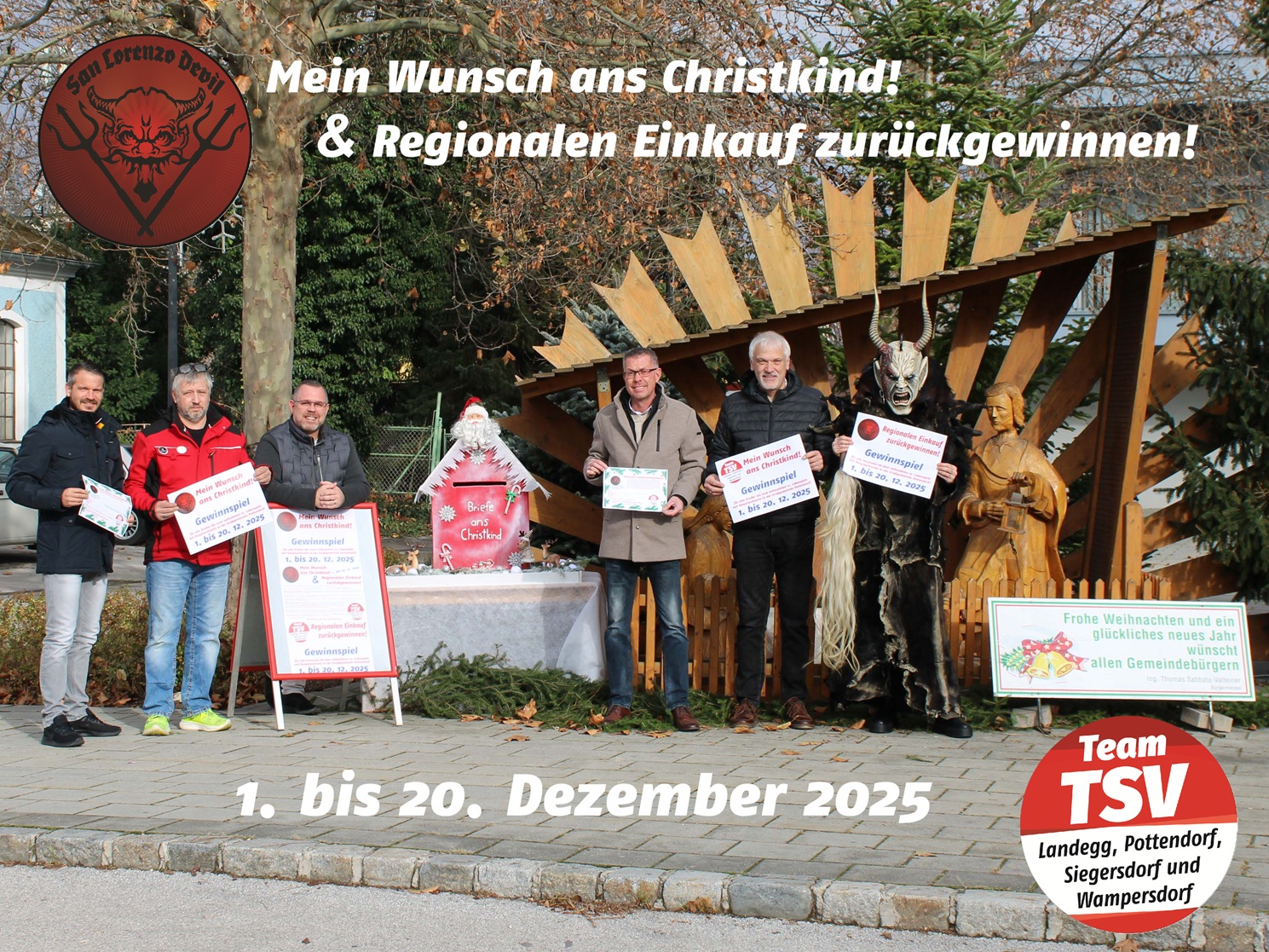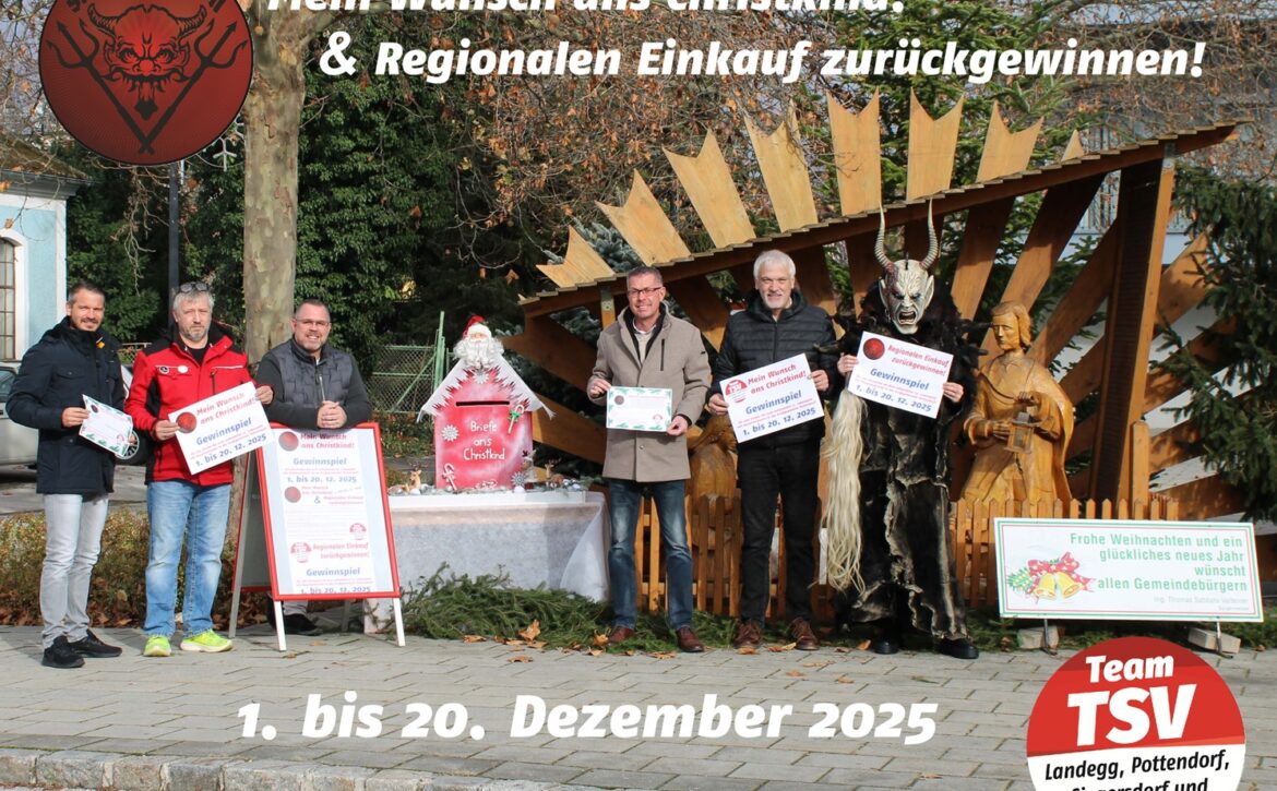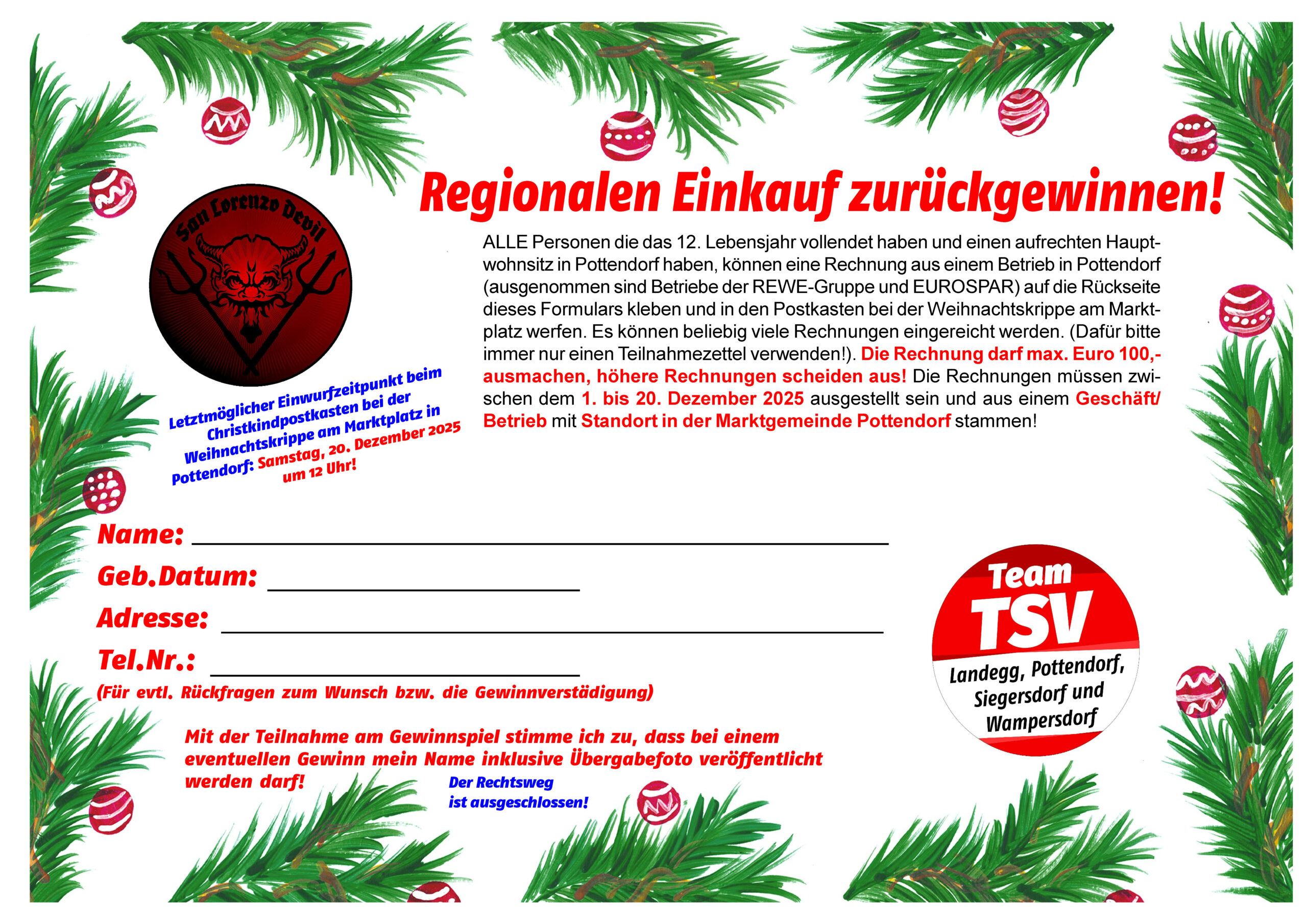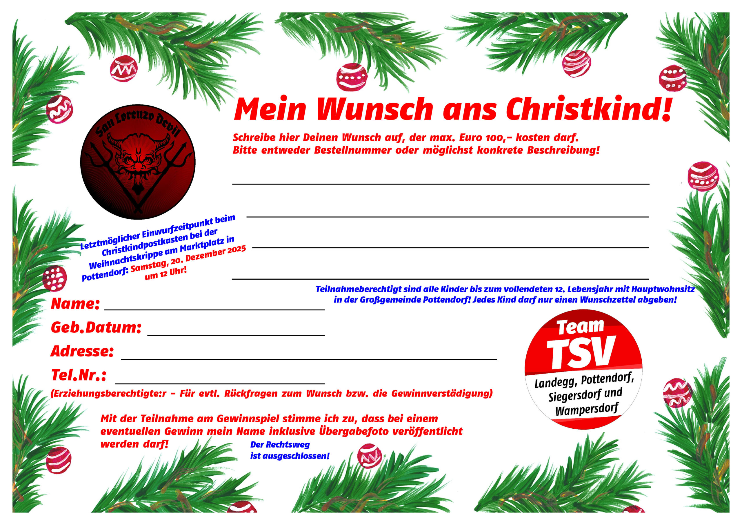 Die Übergabe der Wunsch ans Christkindpreise bzw. die Auszahlung der Rechnungen erfolgt beim Weihnachtspunschstand des Team TSV am Mittwoch, dem 24. Dezember 2025 zwischen 10 und 13 Uhr im Schlosspark!