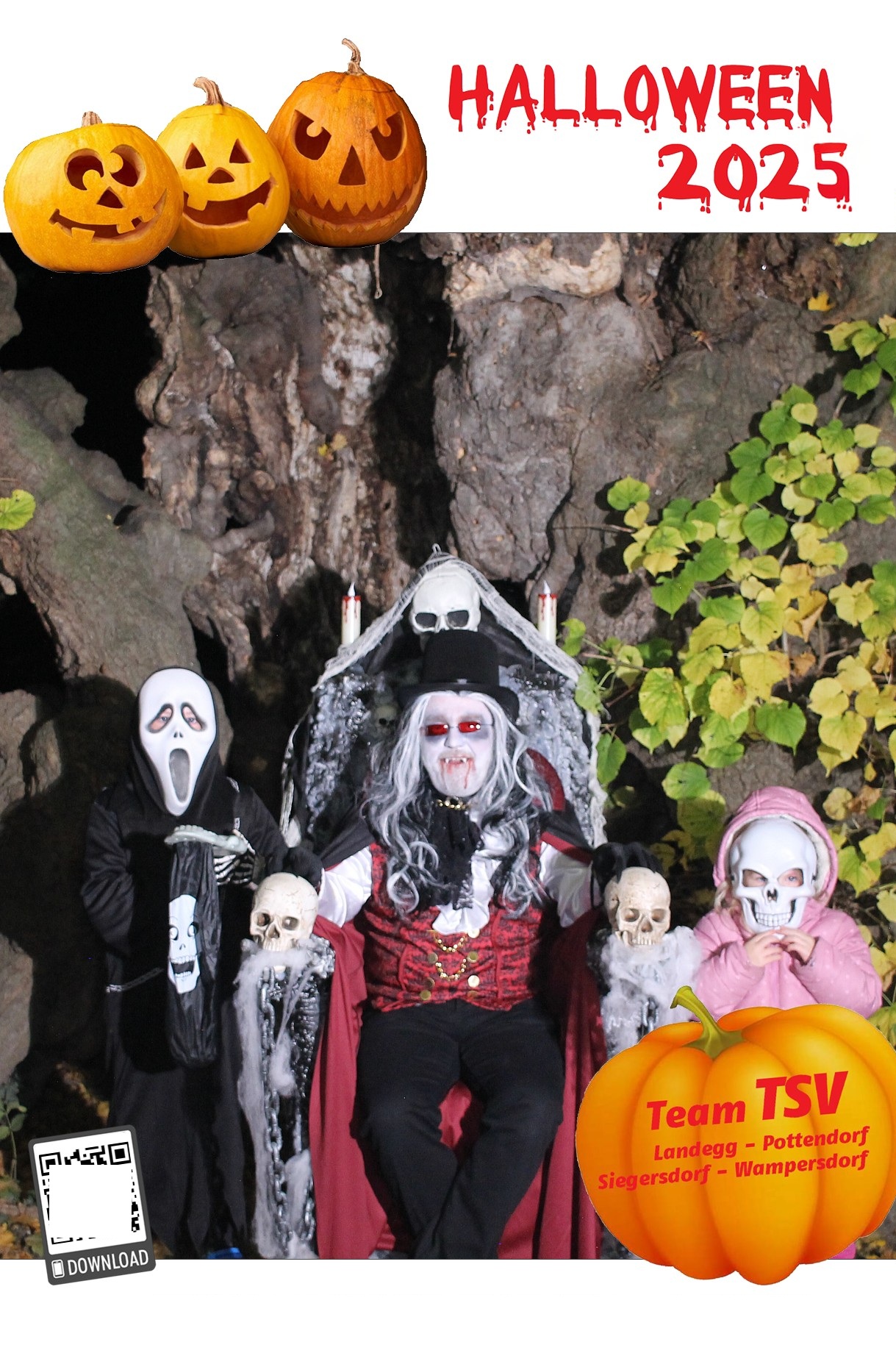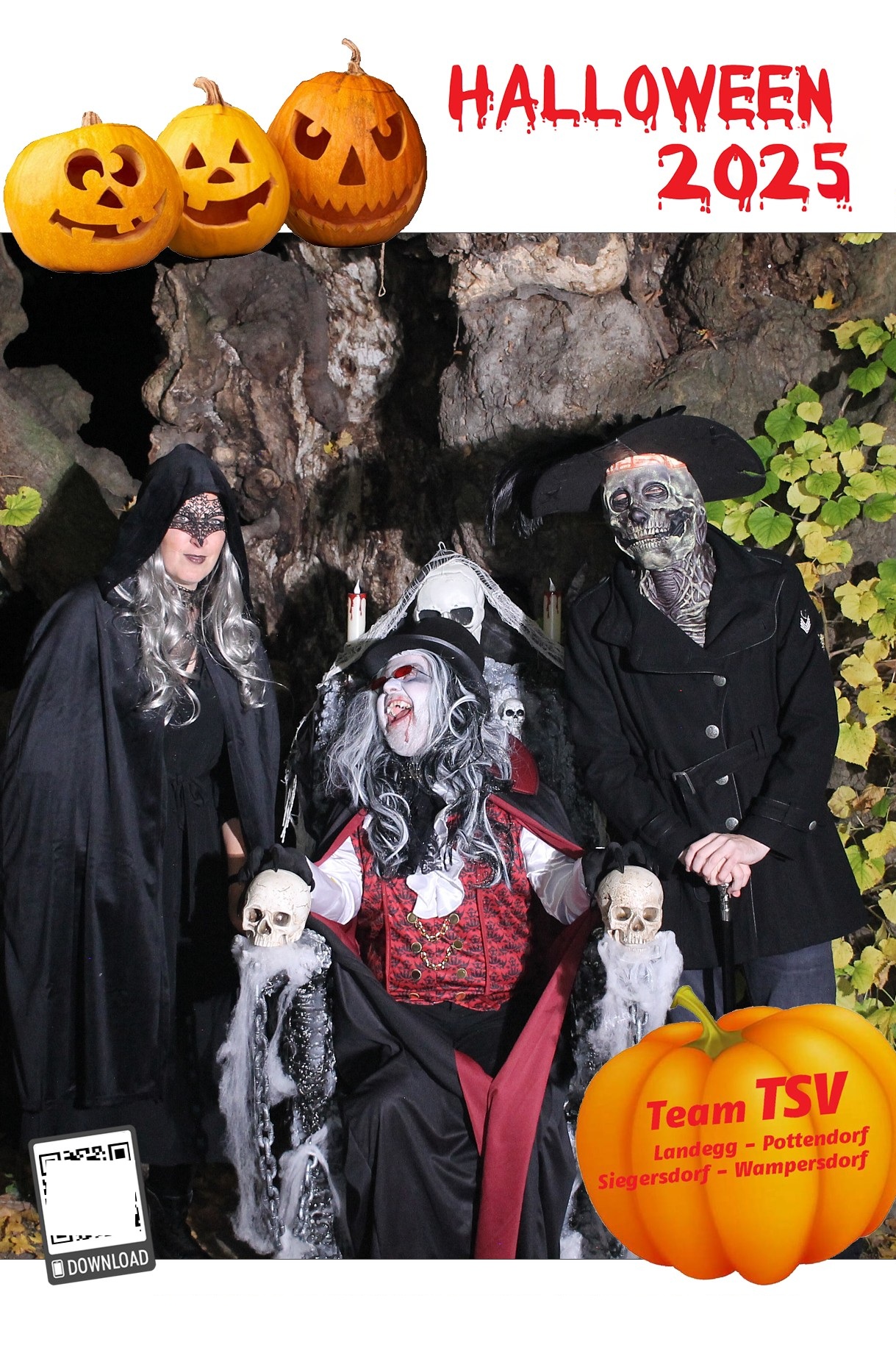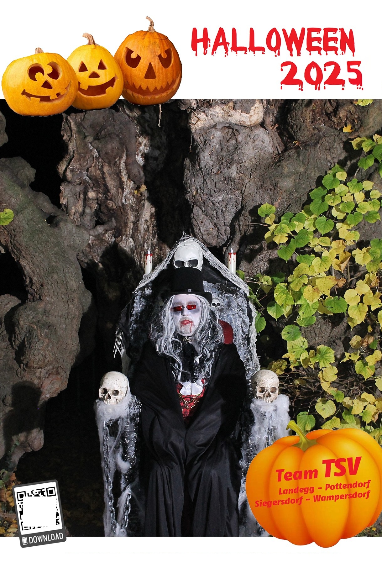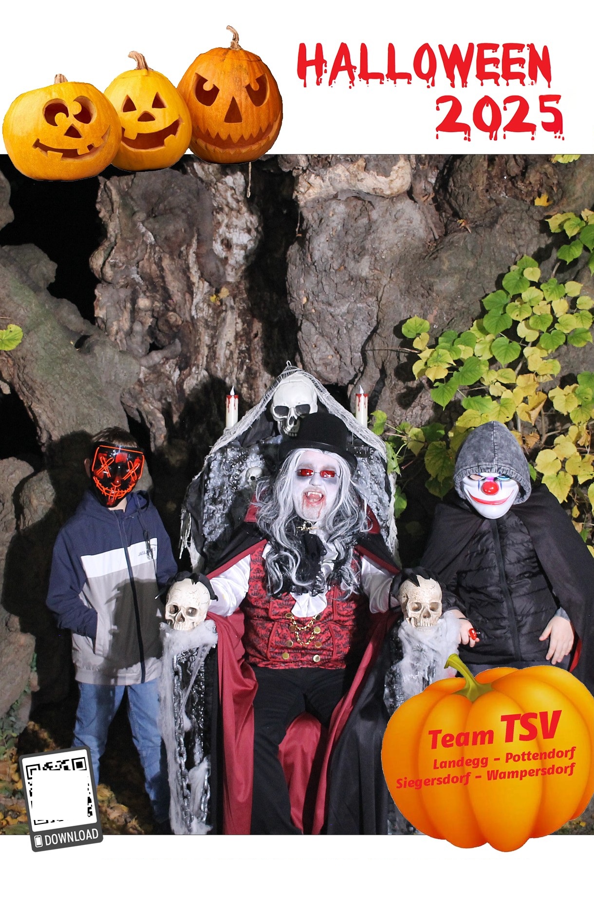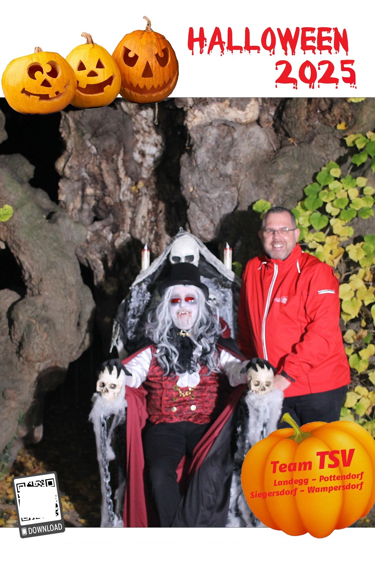 Um 17.30 Uhr machten sich dann rund 700 Besucher:innen auf um die 5 Stationen zu besuchen und sich ein Erinnerungsfoto bei der 1000-jährigen Linde zu holen. Diesmal unterstützte ein Vampir – GR Andreas Fried – Roman Seidl bei der Fotobox.