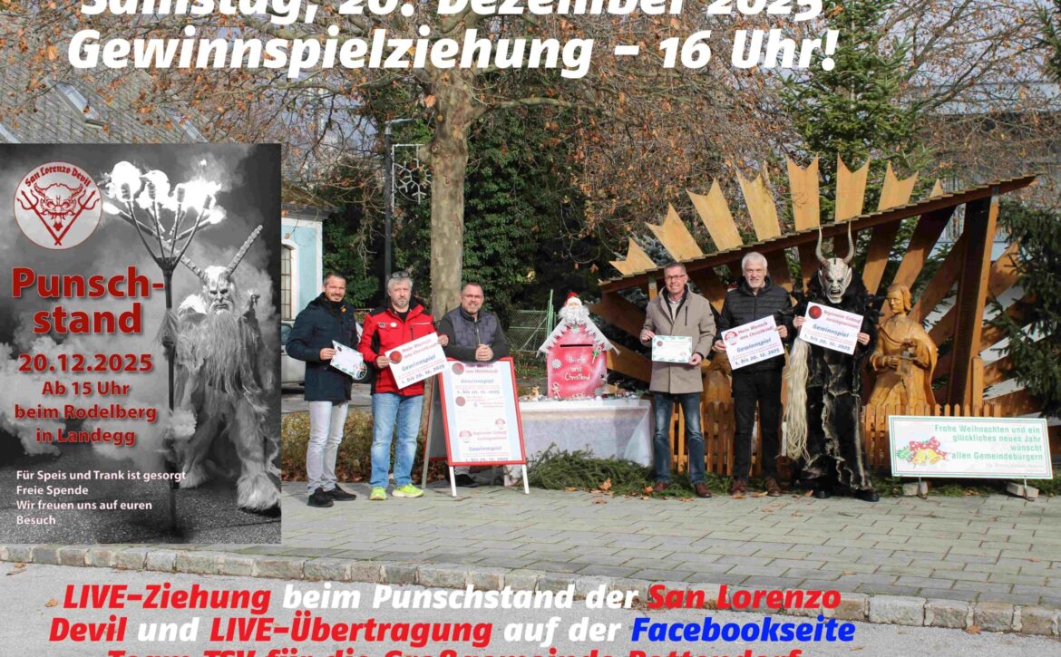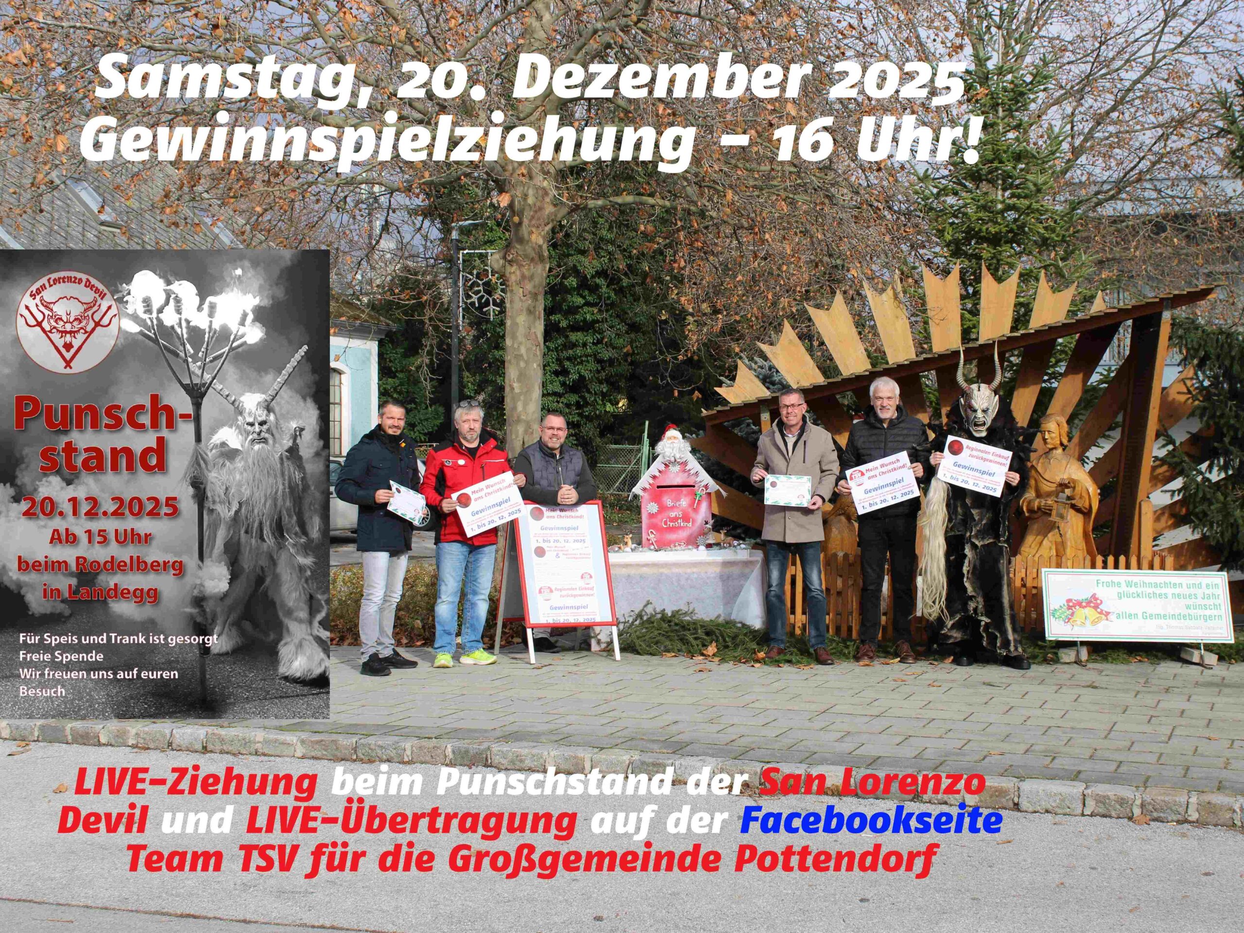 Heute – Samstag, 20. Dezember 2025 – findet um 16 Uhr beim Punschstand der San Lorenzo Devil die LIVE-Ziehung der Gewinner:innen unseres „Wunsch an das Christkind!“ und „Regionalen Einkauf zurückgewinnen!“ statt diese Ziehung wird auch LIVE auf der Facebookseite des Team TSV für die Großgemeinde Pottendorf – https://www.facebook.com/Team.TSV.Pottendorf -übertragen! Schauen Sie sich das an!